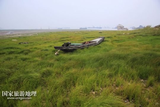 9月19日,漁船擱淺在鄱陽(yáng)湖江西九江市蛤蟆石水域附近長(zhǎng)滿青草的湖床上。