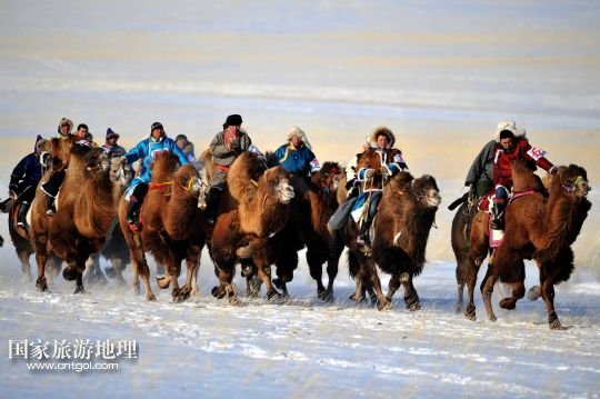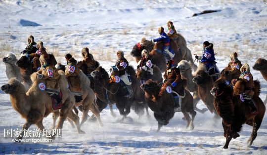 國(guó)家旅游地理 內(nèi)蒙古錫林郭勒1月5日訊 1月5日,牧民們?cè)?0公里駱駝速度賽比賽中。當(dāng)日,內(nèi)蒙古烏珠穆沁駱駝文化節(jié)在西烏珠穆沁旗烏蘭哈拉嘎蘇木舉行。來(lái)自呼倫貝爾、鄂爾多斯以及蘇尼特和烏珠穆沁草原的牧民帶著200多峰駱駝在白雪皚皚的草原上進(jìn)行駱駝選美、10公里駱駝速度賽等以比賽活動(dòng)和民俗風(fēng)情表演,展示內(nèi)蒙古草原上獨(dú)特的駱駝文化。 /新華社記者 任軍川 攝