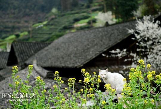 慶陽(yáng)古街花香四溢,一只大白貓?jiān)跇琼敧?dú)享風(fēng)景(3月27日攝)。