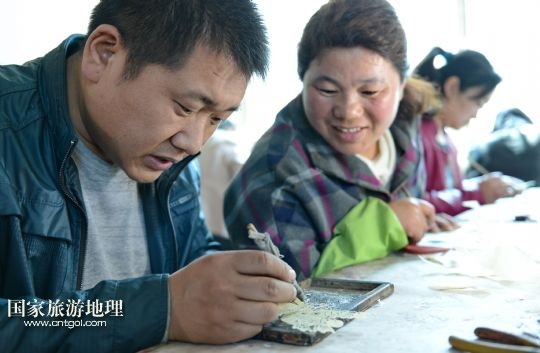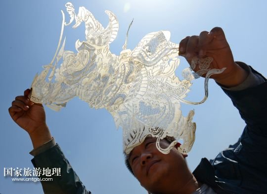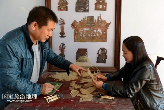 國家旅游地理 河北唐山4月2日訊 郭寶在檢查一件皮影藝術(shù)品的雕刻質(zhì)量(3月30日攝)。河北省遷安市趙店子鎮(zhèn)馬古寺村村民郭寶自幼喜歡皮影雕刻,師承當(dāng)?shù)氐窨趟嚾送跽淅舷壬?,他雕刻的影人造型古樸、工藝精?xì),深受皮影收藏愛好者的歡迎。2003年,郭寶成立了“郭寶皮影傳承工作室”,并從村里招來20多位喜歡皮影藝術(shù)的農(nóng)民專門從事皮影雕刻。經(jīng)過幾年的發(fā)展,如今郭寶皮影工作室開發(fā)設(shè)計皮影工藝品3000余種,在傳承保護唐山皮影的同時還獲得了豐厚的收入。 /新華社記者楊世堯攝