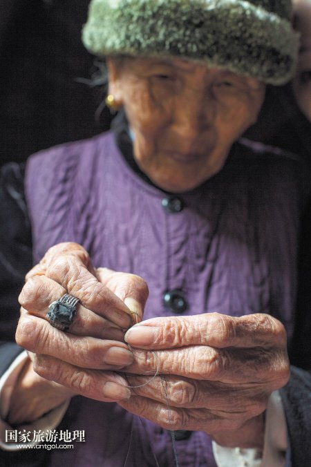 →雖已是84歲高齡,但即便拿著最細的繡花針,廖西鳳也能輕松引線。