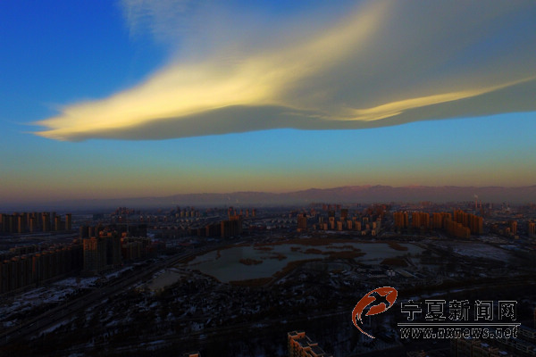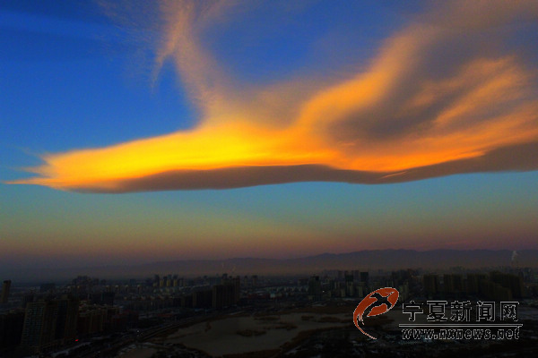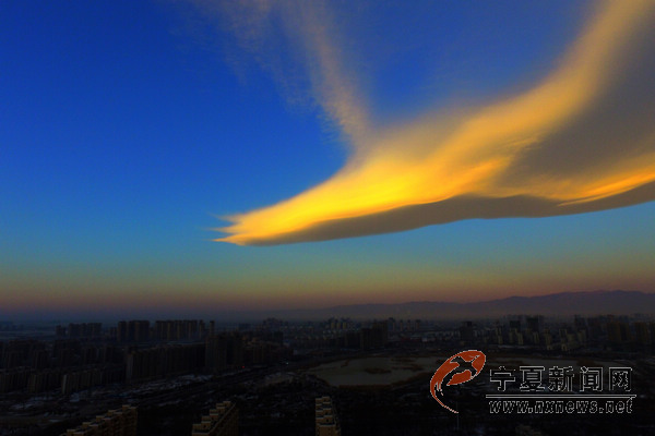 12月26日8時10分許,銀川上空出現(xiàn)奇云,宛如一只展翅飛翔的鳳凰浮于銀川西邊天空,伴著初升的朝陽與巍峨的賀蘭山為伴,格外美麗。 寧夏新聞網(wǎng)記者 祁瀛濤 攝