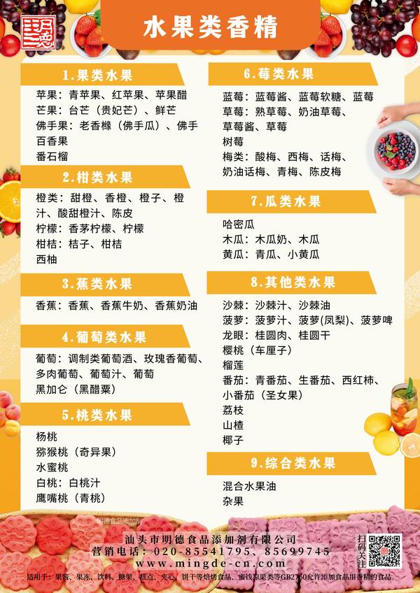 此外,汕頭市明德食品添加劑有限公司在數十年的研發(fā)中推出了眾多水果風味香精,從草莓、芒果、橙子 到 沙棘、佛手果、獼猴桃,應有盡有。歡迎廠家們了解嘗試~