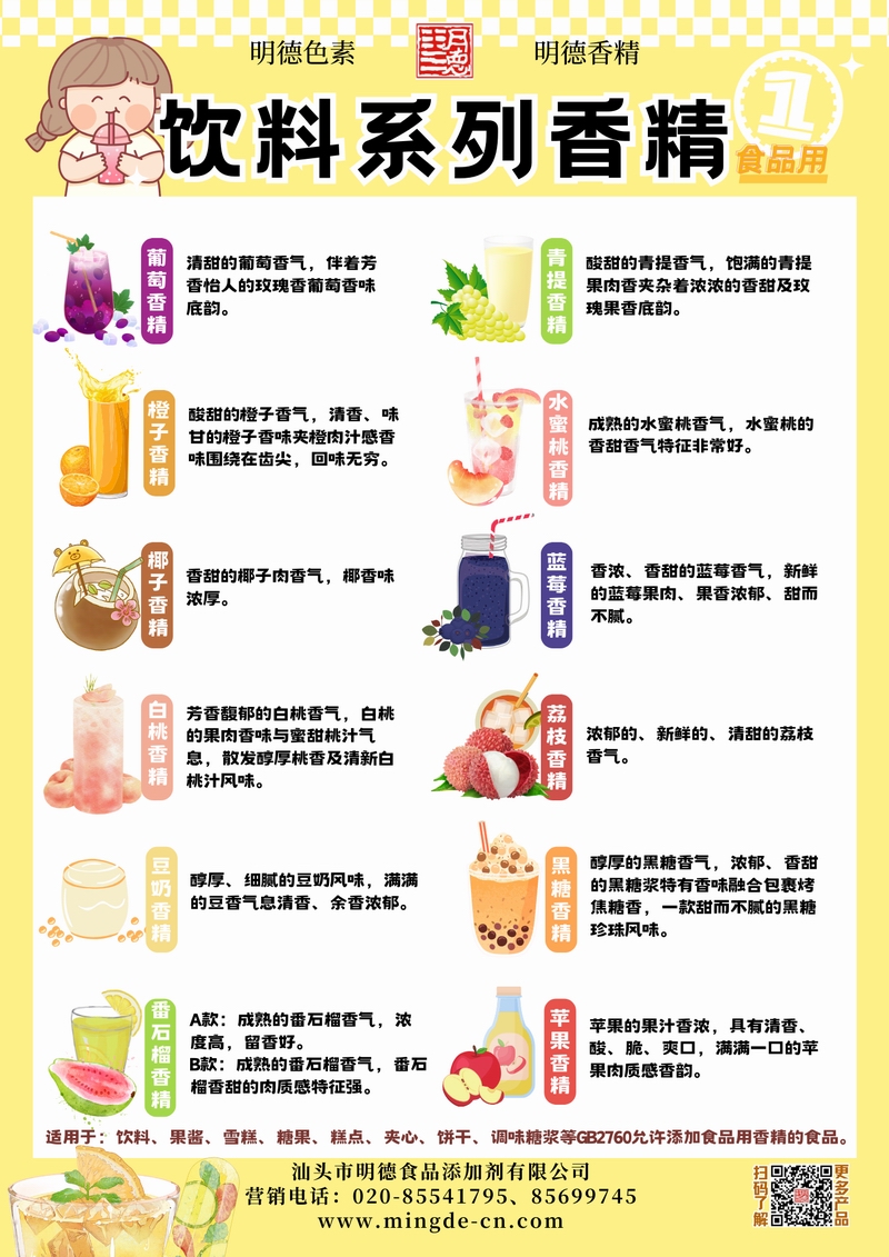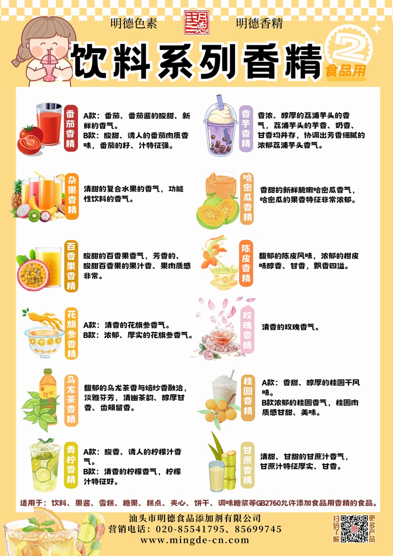 明德飲料系列香精 果香純正 覆蓋多樣飲品場(chǎng)景汕頭市明德食品添加劑有限公司推出的飲料系列香精,涵蓋葡萄、青提、橙子、水蜜桃、椰子、藍(lán)莓、白桃、荔枝、豆奶、黑糖、番石榴、蘋果、青檸、菠蘿、芒果、草莓、檸檬、哈密瓜、百香果、花旗參、玫瑰、雜果、烏龍茶、番茄、香芋、陳皮、桂圓、甘蔗等等多種類目,選擇多樣。產(chǎn)品風(fēng)味真實(shí)、香氣飽滿,適用于飲料、果汁、果醬、糖果、糕點(diǎn)、夾心、調(diào)味糖漿等B端應(yīng)用,幫助工廠快速打造口感豐富、風(fēng)味突出的飲品產(chǎn)品。